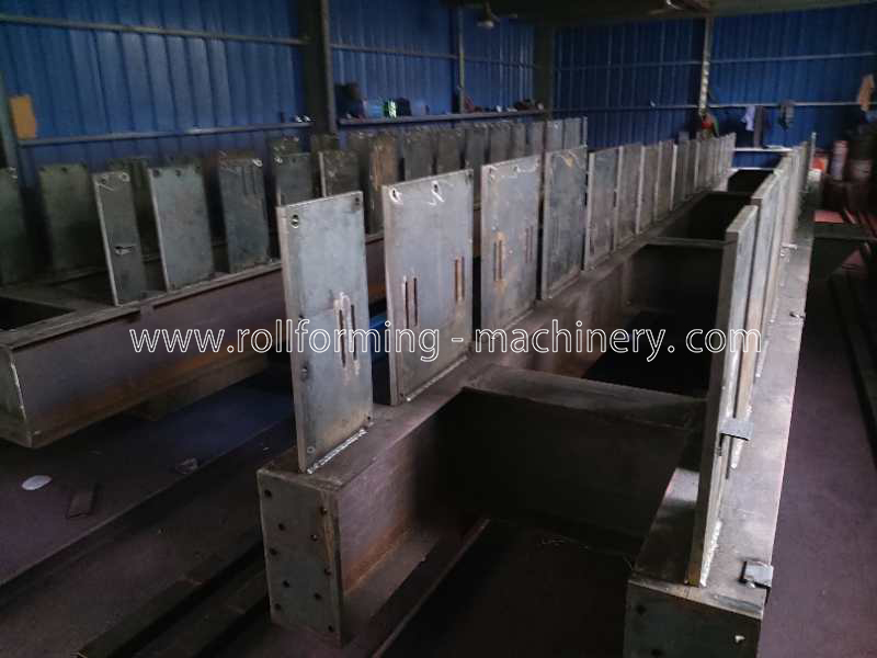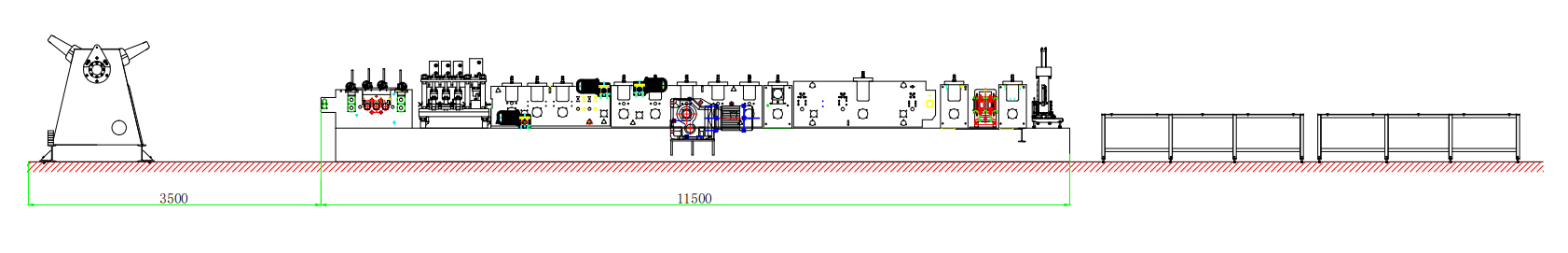 Máy tháo cuộn→Thiết bị cấp liệu và cân bằng→Thiết bị cắt và đột thủy lực→Hệ thống cán định hình→Cắt trụ thủy lực→Giá đỡ ra