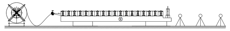 Máy cuộn dây →Thiết bị cắt sơ bộ thủ công → Cho ăn Thiết bị dẫn đường → Hệ thống cán định hình → Thiết bị cắt trụ thủy lực → Giá đỡ thoát hiểm